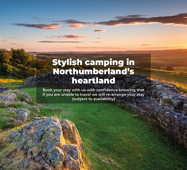 Rated 5 AA Platinum Pennant and 5-star by Visit England, our Northumberland campsite with glamping, camping, touring and luxury lodge with outdoor hot tubs, is just 1 mile from Hadrian’s Wall in Northumberland, North East England. Tents welcome. Family and dog friendly Dark Skies campsite with spectacular stargazing, we are a low noise site and do not allow group bookings without prior discussion. Book your stay with us with confidence knowing that if your travel plans are impacted you can move your stay or receive a full refund.